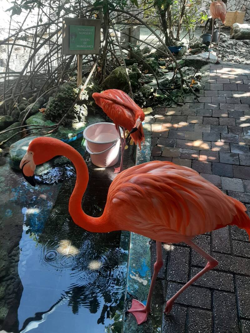 Bij binnenkomst zie je als eerste de flamingo's. Helaas zitten ze wel in een redelijk klein hok naar mijn idee en hebben ze niet veel ruimte om hun behoeftes te doen of te kunnen verstoppen voor het publiek (daar hebben ze helemaal geen ruimte voor). Ik hoop en ga er van uit dat er een ander verblijf voor de flamingo's is wanneer het park gesloten is. Verder hebben ze om de flamingo's heen meerdere aquariums met vissen. Denk aan de meest bekende koraalduivels of morenen. Ook veel kleine visjes hebben ze in de aquariums zitten en heel veel koraal.